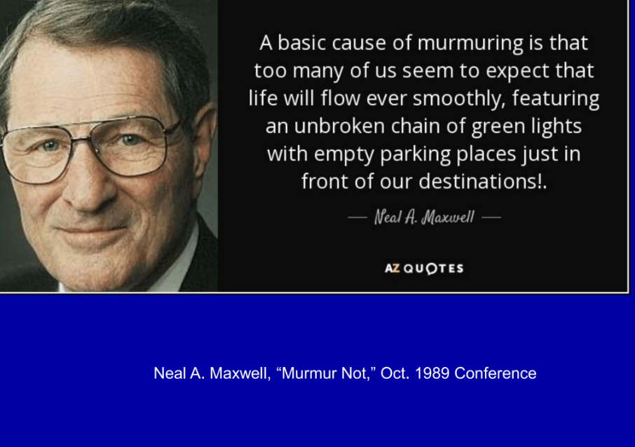 A basic cause of murmuring is that too many of us seem to expect that life will flow ever smoothly, featuring an unbroken chain of green lights with empty parking places just in front of our destinations.”
