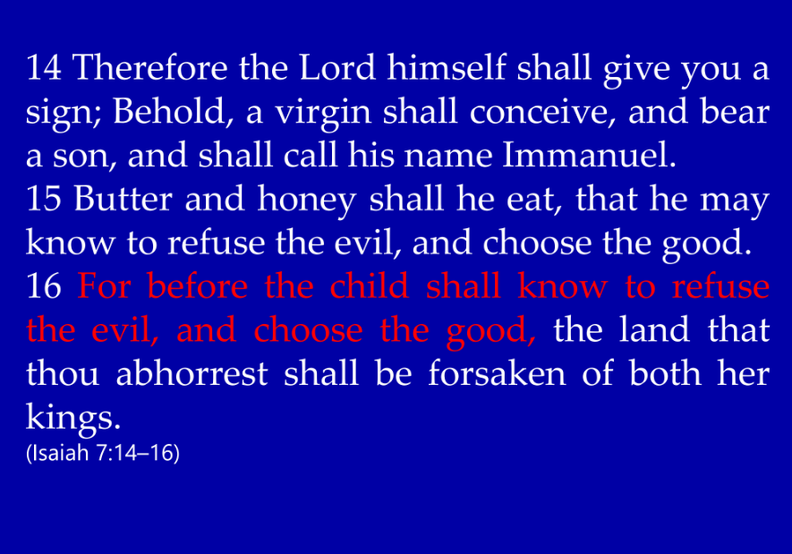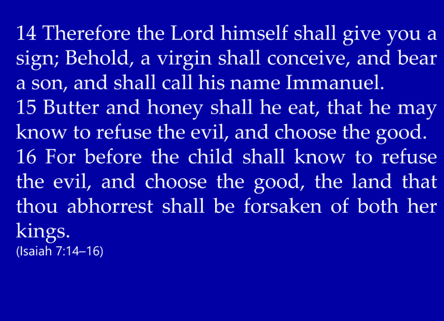 And Isaiah said, “Hear ye now, O house of David’, meaning the king of Judah, Ahaz, ‘is it a small thing for you to weary men? But will ye weary my God also? Therefore, the Lord Himself will give you a sign: Behold, a virgin shall conceive and bear a son and shall call his name Emmanuel, meaning God is with us. Butter and honey shall he eat that he may know to refuse the evil and choose the good. But before the child shall know to refuse the evil and choose the good, the land that thou abhorrest shall be forsaken of both her kings.'”