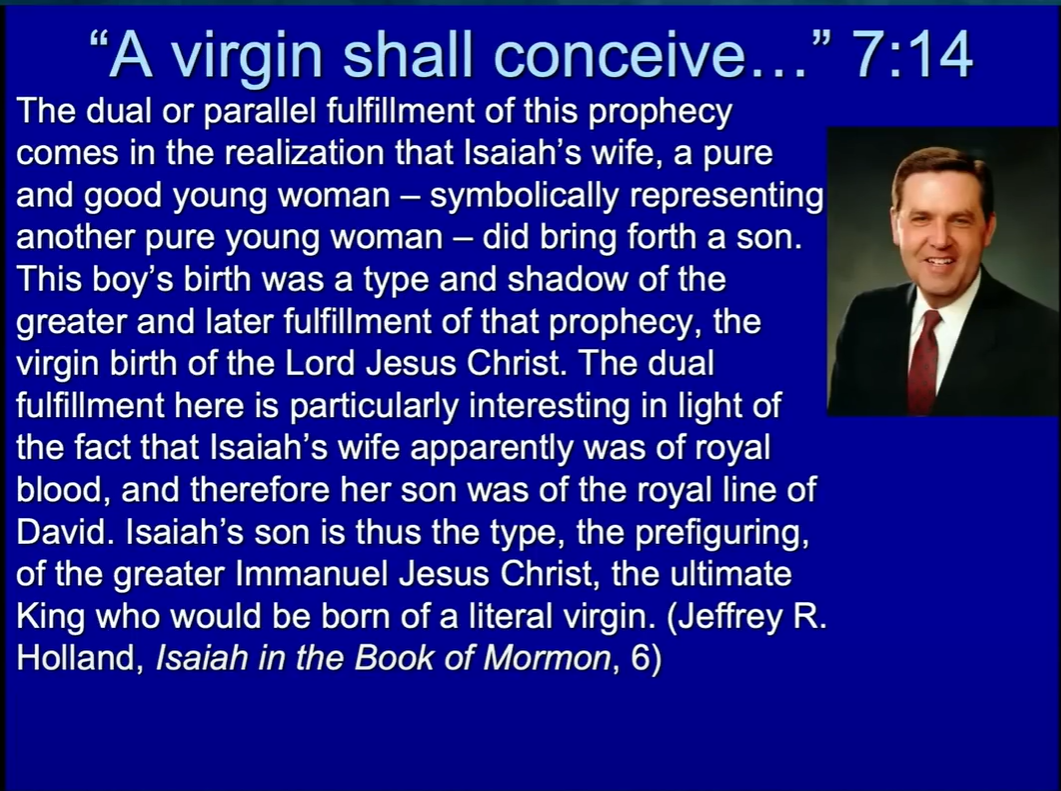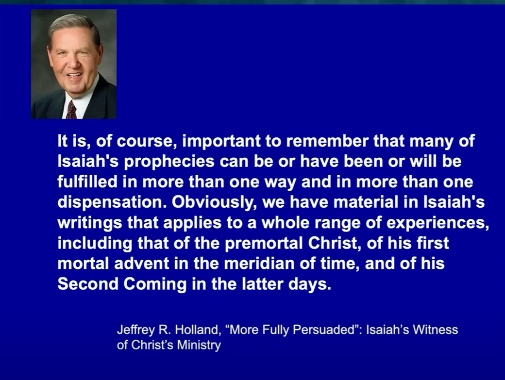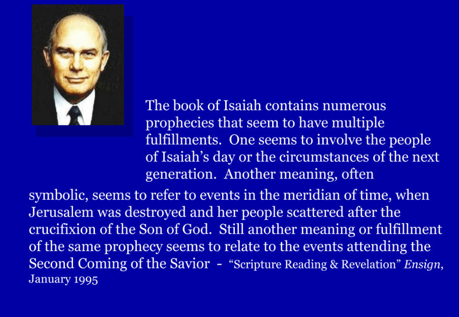 It is, of course, important to remember that many of Isaiah’s prophecies can be, or have been, or will be, fulfilled in more than one way and in more than one dispensation. Obviously, we have material in Isaiah’s writings that applies to a whole range of experiences, including that of the pre-mortal Christ, of his first mortal advent in the meridian of time and of his second coming in the latter days.”