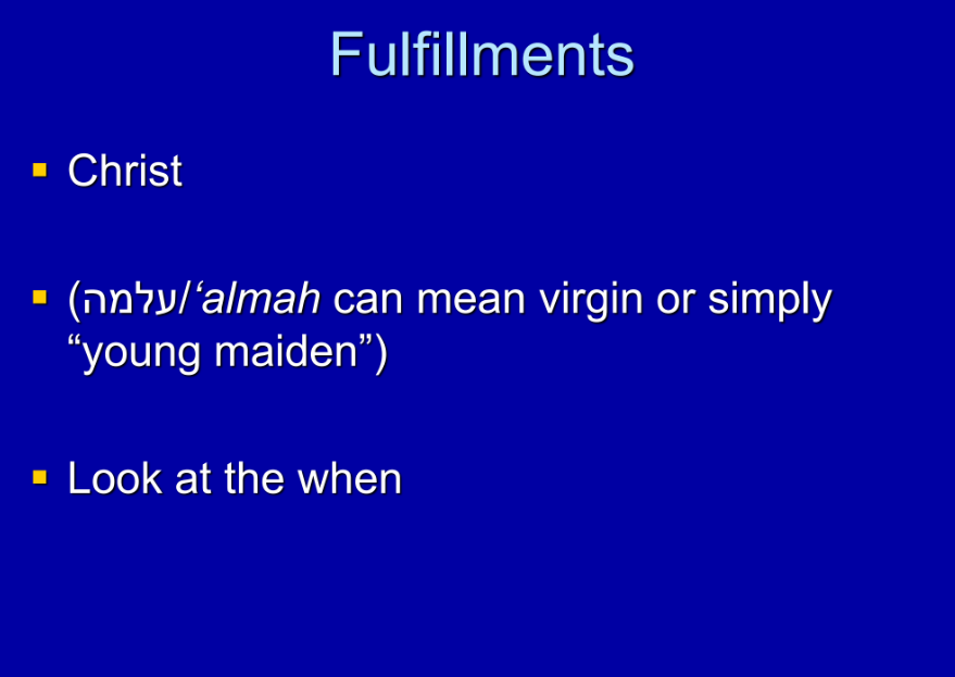 A virgin, and the word is alma, all right? There are two words for virgin; one means virgin and it doesn’t mean anything else. That’s not the word that Isaiah uses. He uses a word that’s a little more vague, almah, which can mean virgin, but what it really means is “young woman” most of whom are virgins, but it just means young woman right, not necessarily a virgin. And so this is important, because it can be interpreted in more than one way, and that’s Isaiah’s intent.