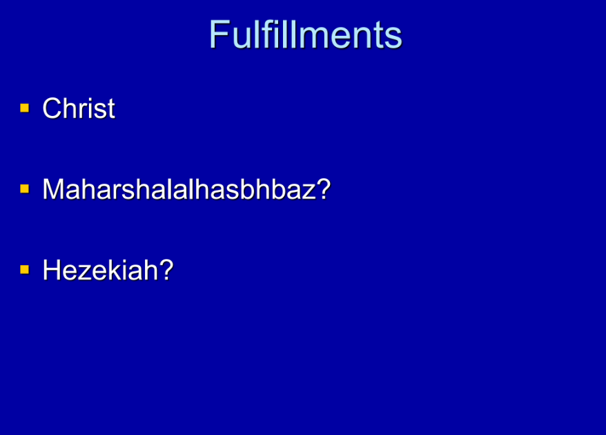 So, it would seem that Maher-shalal-hash-baz is a fulfillment. He is conceived of a young maiden, and it will be clear by the time he is roughly two years old, and those two kingdoms are destroyed, that God is with them.