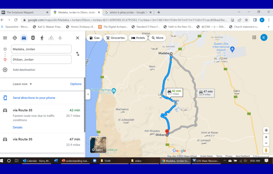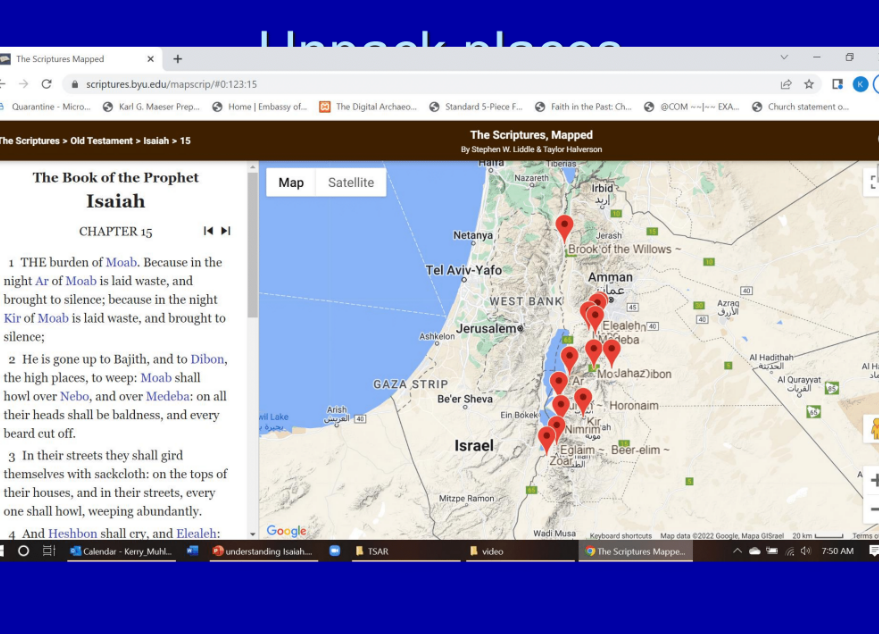 One thing you can do is go to a place – I should have had it written up somewhere – but I’ll just tell you the web address: scriptures.byu.edu. All right, that’s scriptures.byu.edu, and just going there is wonderful, but this particular tool – go to scriptures.byu.edu/mapscrip (note–just s c r i p … no “t”). Then you’ll have all the scriptures in front of you, and here, I’ve chosen Isaiah, then I chose chapter 15, and you can see it automatically populated all of the sites that are mentioned in that chapter. So, you get an idea – one of the pictures he’s painting is everywhere in Moab there was destruction.