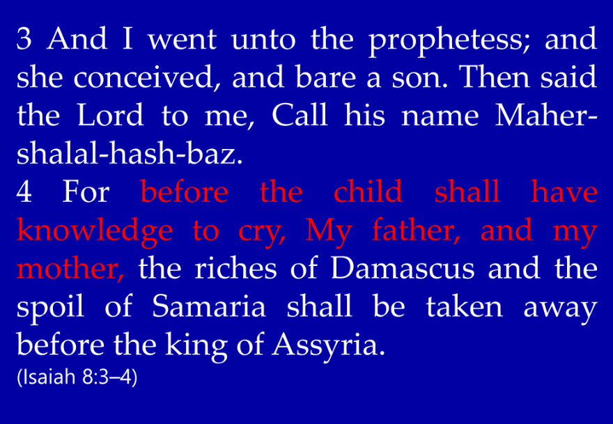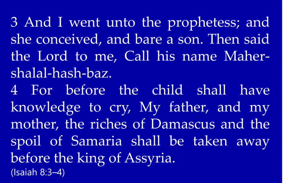 Now let’s look at chapter eight. “And I went unto the prophetess; and she conceived, and bare a son. Then said the Lord to me, call his name Maher-shalal-has-baz,” which is a really cool name, “for before the child shall have knowledge to cry, My father, and My mother, the riches of Damascus and the spoil of Samaria shall be taken away before the king of Assyria.”