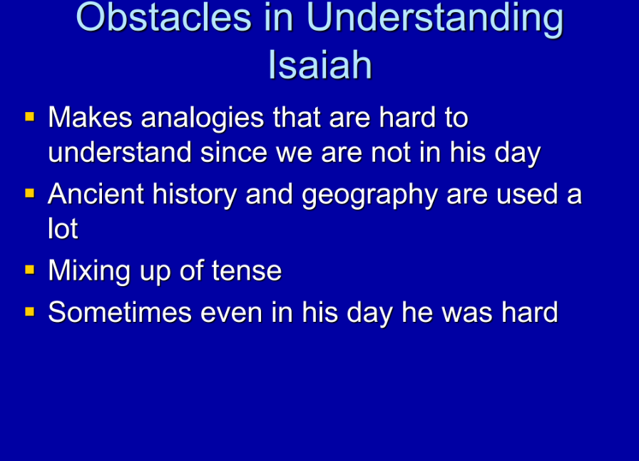 There are some obstacles in understanding Isaiah that I hope we can kind of look at and then figure out how to get past them. There are a number of obstacles; some of them are that he makes analogies that are really hard for us to understand because he’s drawing on cultural elements of his day. Since we’re not familiar with them, that can be difficult for us.