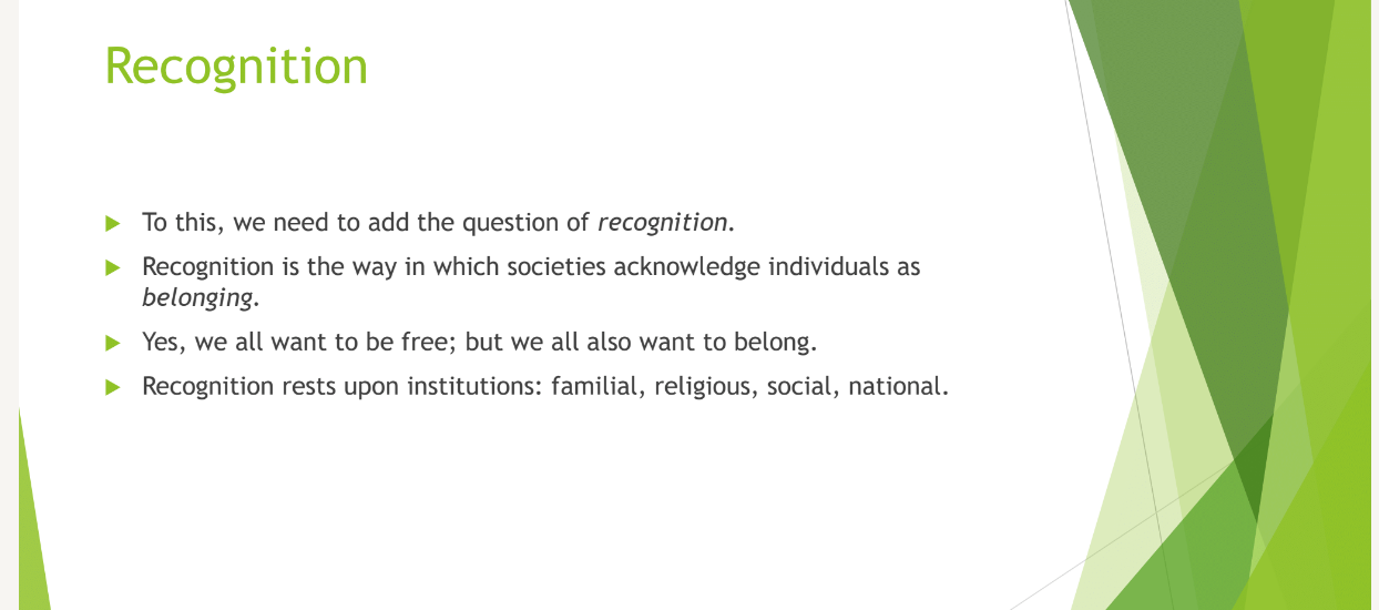 To this, we can add the question of recognition. Well, what’s recognition? Is it me walking down the street and seeing Scott and Sheri and saying ‘Hi Scott and Sheri,’ recognizing them? No. That is a form of recognition. What I’m talking about here is recognition that comes from the set of rules that society has for acknowledging individuals as belonging.