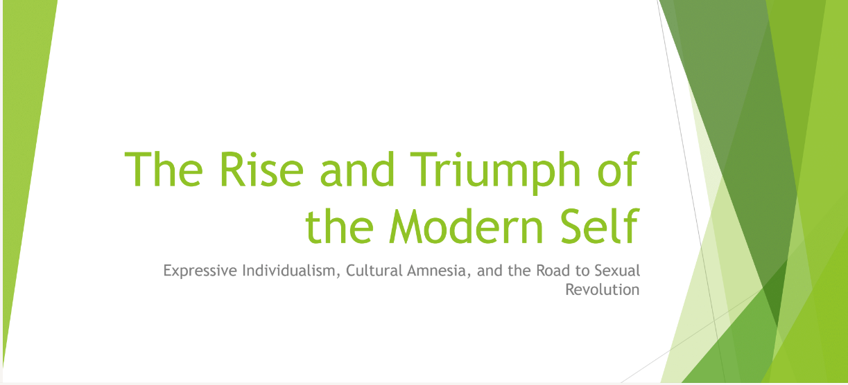 My topic today is to talk about my book. It sounds like a shameless commercial plug. My topic is to talk really on the issues that I raise in the book I’ve written recently. If you listen to my lecture, it saves you having to buy and to read the book, of course. The book is entitled simply The Rise and Triumph of the Modern Self: Expressive Individualism, Cultural Amnesia, and the Road to Sexual Revolution.