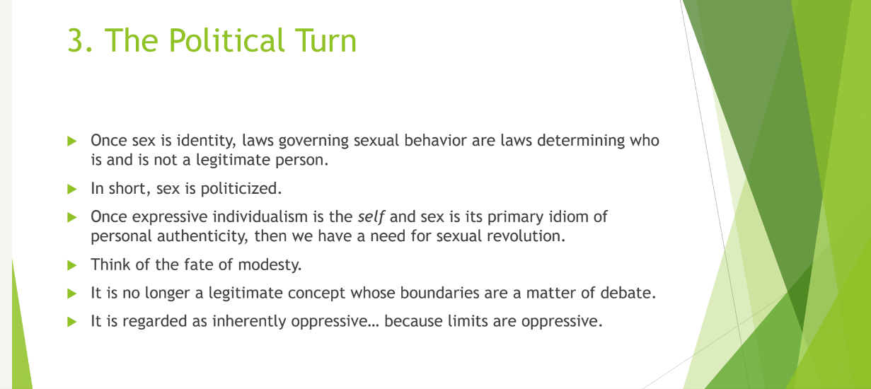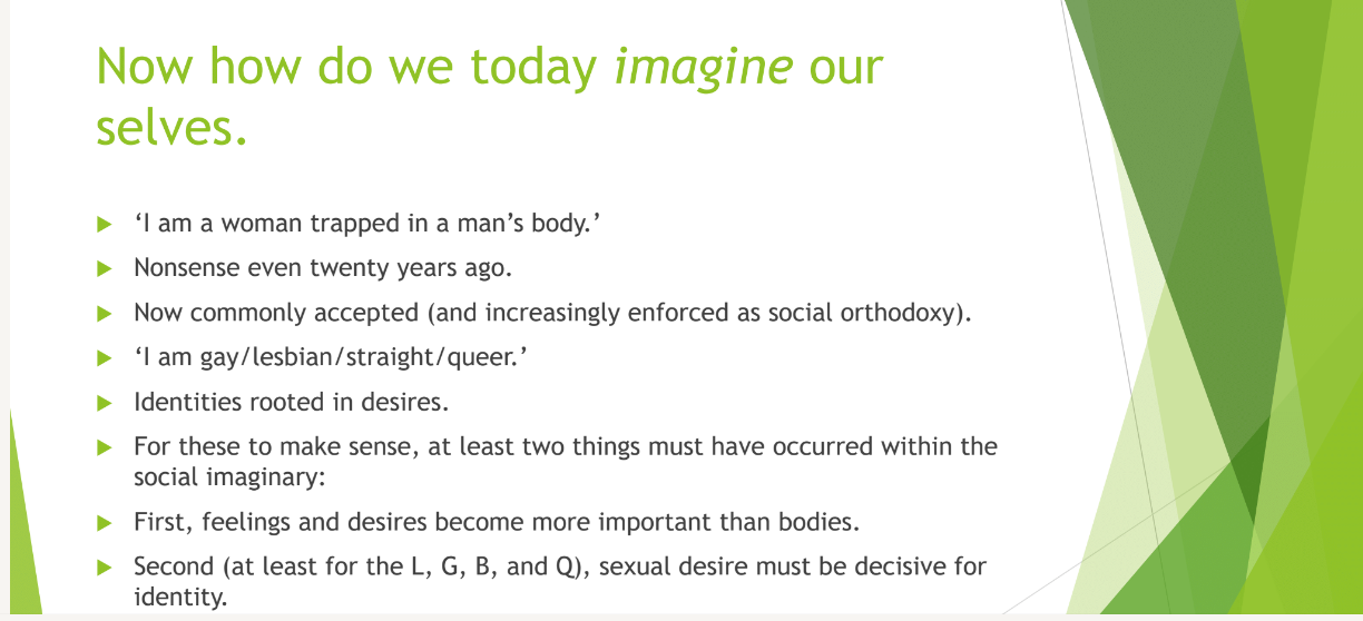 Okay, not saying what’s right or wrong in this situation, just pointing to the fact that that shift indicates something, indicates that desires and feelings, psychological states, have come to have a profound authority, such that even the body must give way to it. And secondly, and this is, at least for the L, the G, the B, and the Q—I haven’t got time to talk about the interesting relationship between these and the T in LGBT—sexual desire must become crucial for identity. I don’t think the erotic, sexual desire plays quite the same role in transgenderism. I think the coalition is one, in some ways, of convenience. But certainly for those first letters, erotic desire, sexual desire, must become authoritative for identity.