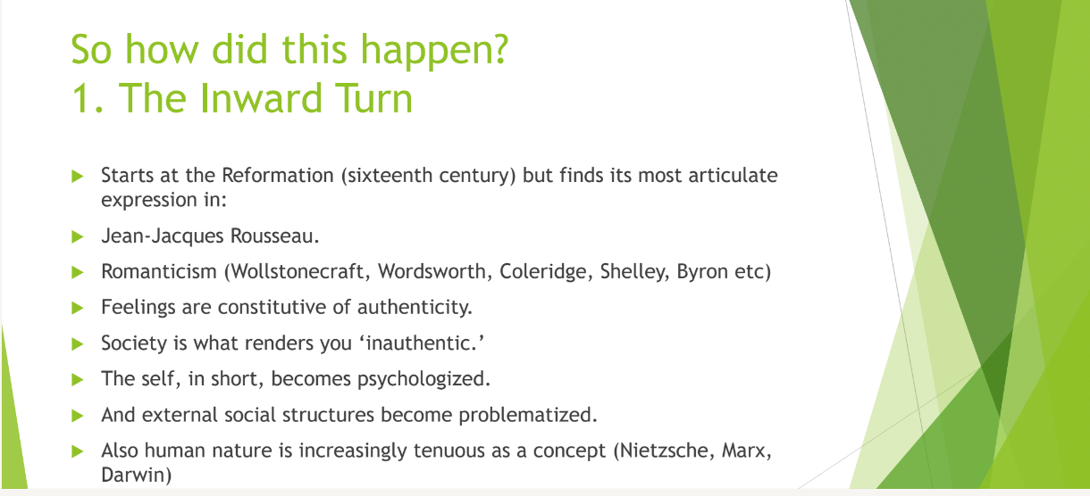 So how did it happen? I’m going to give you a very simplistic story at this point. I’ll give you the bare bones, and you can go away and read up yourself. Probably starts sort of at the Reformation, 16th century, the crisis in institutional authority in the church. The rise of the printing press tends to put more emphasis upon the responsibility of the individual to believe, so the individual begins to emerge, if you like, and the inner life of the individual, which has always been there but begins to become more important. Key figure though, after the Reformation is this Genevan philosopher, Jean-Jacques Rousseau.