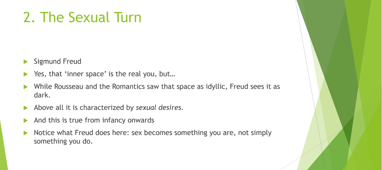 Secondly, there’s a sexual turn. Sigmund Freud is the key figure here. Sigmund Freud is the man who says in his three essays on sexuality he developed, that we can calibrate human development in terms of the nature and direction of sexual desires. So even the infant in the crib is shaped ultimately by sexual desires. For Freud, of course, that was love of the mother and fear of the father, the Oedipus Complex. Now what’s interesting about Freud is that most of his theories have been debunked, but that idea that the inner space is sexual continues to grip the imagination.