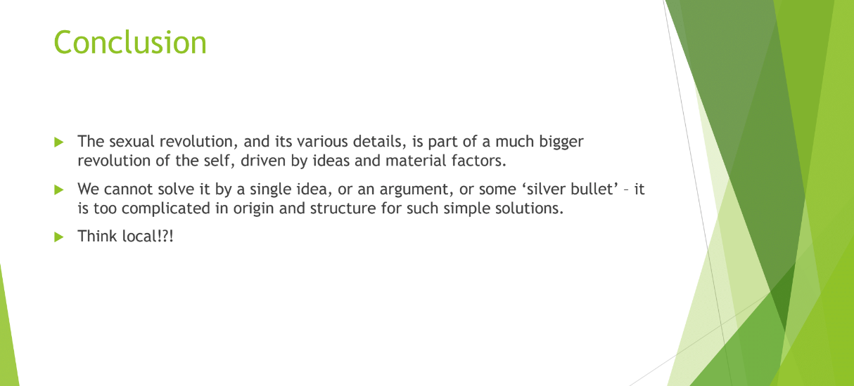 So what do we do about this? Well first of all, understand that the sexual revolution is part of this much bigger picture, this emergence of what I call plastic humanity lies behind the sexual revolution. It just happens that we live at a time when sex and sexual desire is the dominant way of expressing this stuff, but it’s been around for a long time and it’s doing more, it’s creating more social transformation now than at any point before because our institutions are in collapse.