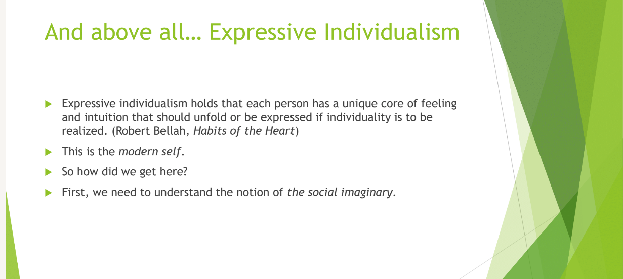Expressive individualism holds that each person has a unique core of feeling, an intuition that should unfold or be expressed if individuality is to be realized. That’s very much what Jeff was saying last time, and it connects very much to that term authenticity.