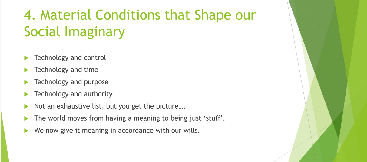 And fourthly, there are technological material conditions. I can only focus here on technology, there are others. Think about how technology shapes the way we imagine the world. The more technology we have, the more power we imagine we have. If you’re a medieval peasant, as my ancestors almost certainly would have been, you’re pretty beholden to the elements. You’re going to be rooted in agriculture. You have to sow your seed at a certain time of the year, and you have to harvest it at a certain time of the year. You are very, very dependent upon nature.