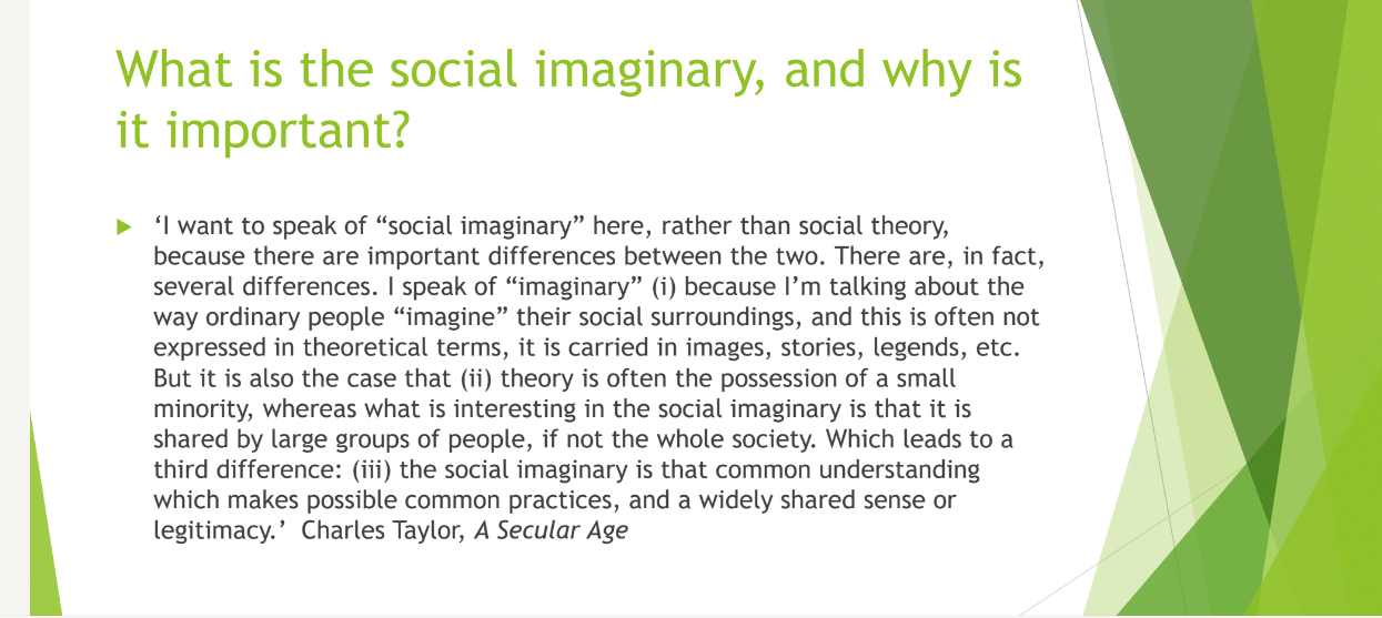 But here, he gives a good definition of the social imaginary. It’s an awkward term because for most of us, “imaginary” is an adjective, and he’s actually using it as a noun here. And when I quoted this in my book, one of my editors came back to me and said, “Don’t you mean ‘imagination’?” I said, “Well, if it was me, I would say that, but I’m quoting him.” And he uses this rather awkward term. It’s wonderful—academics are always good at making fairly straightforward ideas seem rather obscure when they talk about them. But here, he says this: