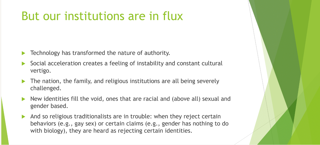 When we reject certain behaviors, we’re heard as rejecting certain identities, and what happens when institutions collapse, identities collapse. But that need for recognition and belonging remains, and so new institutions and new identities fill the void.