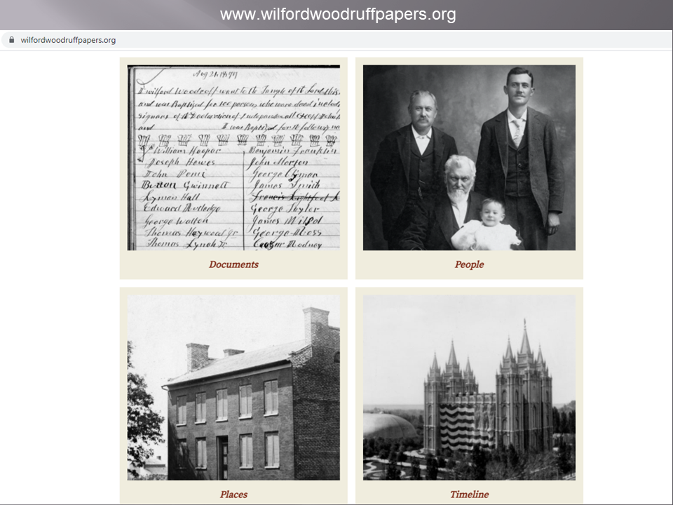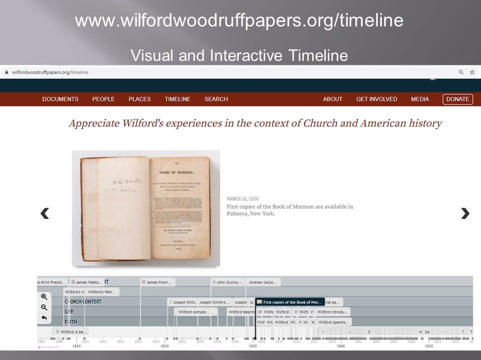 The other thing is a visual and interactive timeline. So, when I was doing my research, I had to keep a notebook. Like when you read War and Peace, you have to write down all the different characters and try to keep them all straight. So, the timeline became Wilford Woodruff’s life in the context of church and US history.