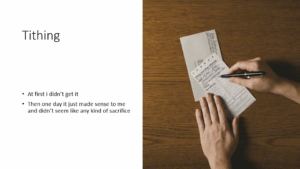The next one: tithing. Ten percent of your income. You know, I was all about me. Why would I give you—or anybody else—ten percent of my income?
