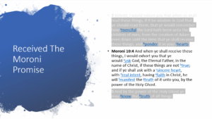 And the the Moroni promise. I was praying to know if I should join the Church. It took five months. And every time I prayed, I’d get an answer: “No, don’t join the Church.”