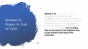 I went into a little room, and I prayed to know what to do. I opened up my scriptures—these were the days of hard copy scriptures—I just went bam, stuck my finger in, and hit Mosiah 7:15: