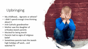 Anyway, I was a stubborn, hard-hearted unbeliever. I am not proud of who I was. I don’t know if I was an agnostic or an atheist—as a child, I didn’t really think that much about it. My grandmother was an Irish Catholic, and my mother was the daughter of an Orthodox Jewish family. I was mocked for being Jewish. I don’t know why—we didn’t seem to act Jewish in any way. My parents had no signs of religious beliefs. Sometimes they took off the High Holidays and watched TV. So my upbringing was really… nothing.