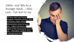 Well, roll forward—from the 60s to the mid-80s—as I was a younger adult. I was lost. I had a lot of fun, way more fun than I have now, but I had no joy at all.