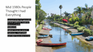 In the mid-80s, people thought I had everything. My house was—I think it’s the fourth one on the right in this picture. I lived in the Venice Canals. I had a fancy car and a sailboat in Marina del Rey down the street. And people thought I had everything.