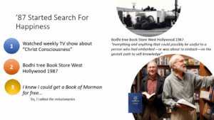 Well, there was a Book of Mormon on the shelf. Now why there was a Book of Mormon there, I have no idea. But I thought that was interesting. I said, “Well, I don’t have to buy that. People have been trying to give me one of those for decades.” So I left the Bodhi Tree Bookstore. I had a bunch of books on Christ Consciousness and visualizing what you wanted and getting it. And I came back and I phoned the missionaries so I could have a free copy of the book.