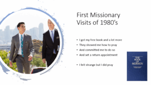 They asked me if I would pray after the first discussion. I said I would, but I really didn’t intend to. In fact, I didn’t intend to have them back at all. But they did set a return appointment. At the time, I was kind of lonely. I had gotten rid of the girlfriend. I was trying to figure out my life. So I said, “Sure, you can come back.”