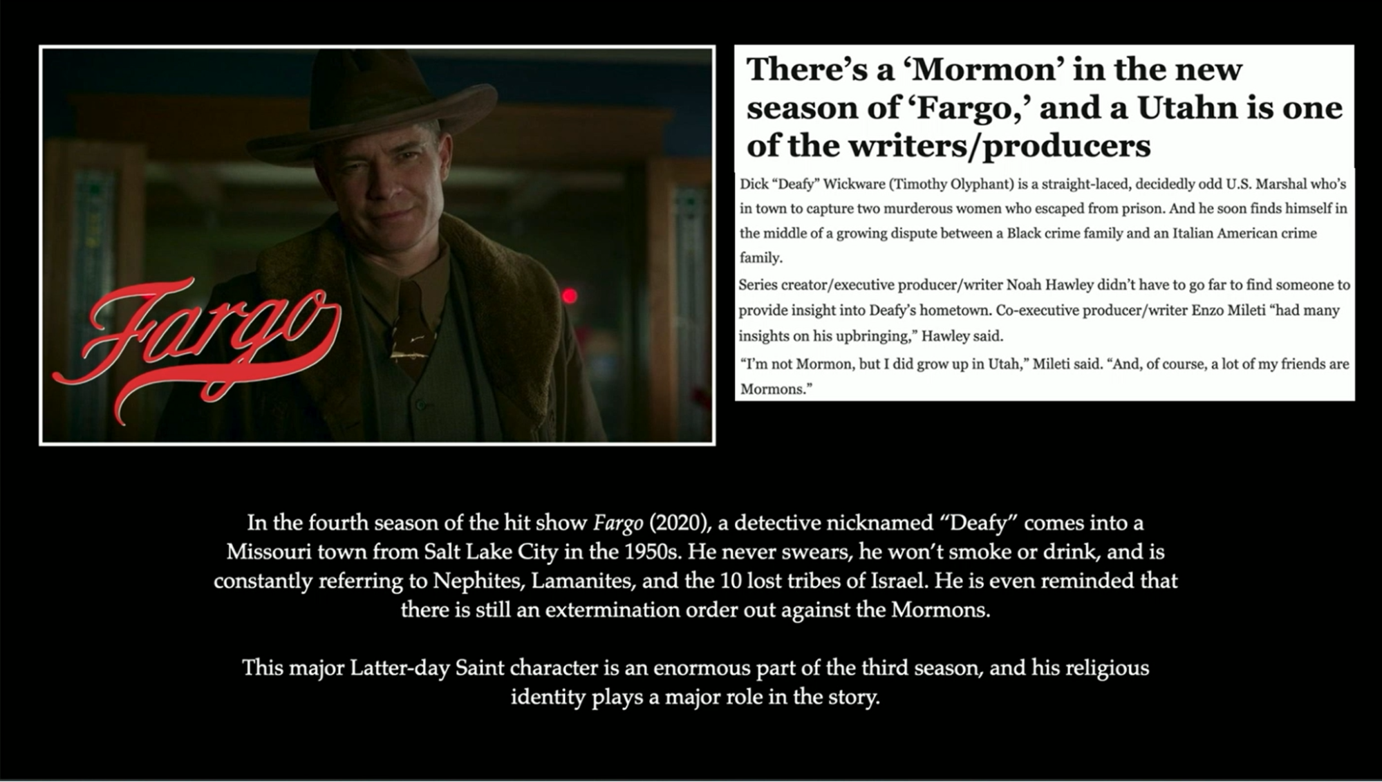 Fargo, a very, very good and well made TV show. In its most recent season, 2020, it features Detective Deffy, who comes into Missouri from Salt Lake City in the 1950s. He never swears, won’t smoke or drink, and is constantly referring to the Nephites, Lamanites, and the 10 lost tribes of Israel. He’s even reminded that there is still an extermination order against him.