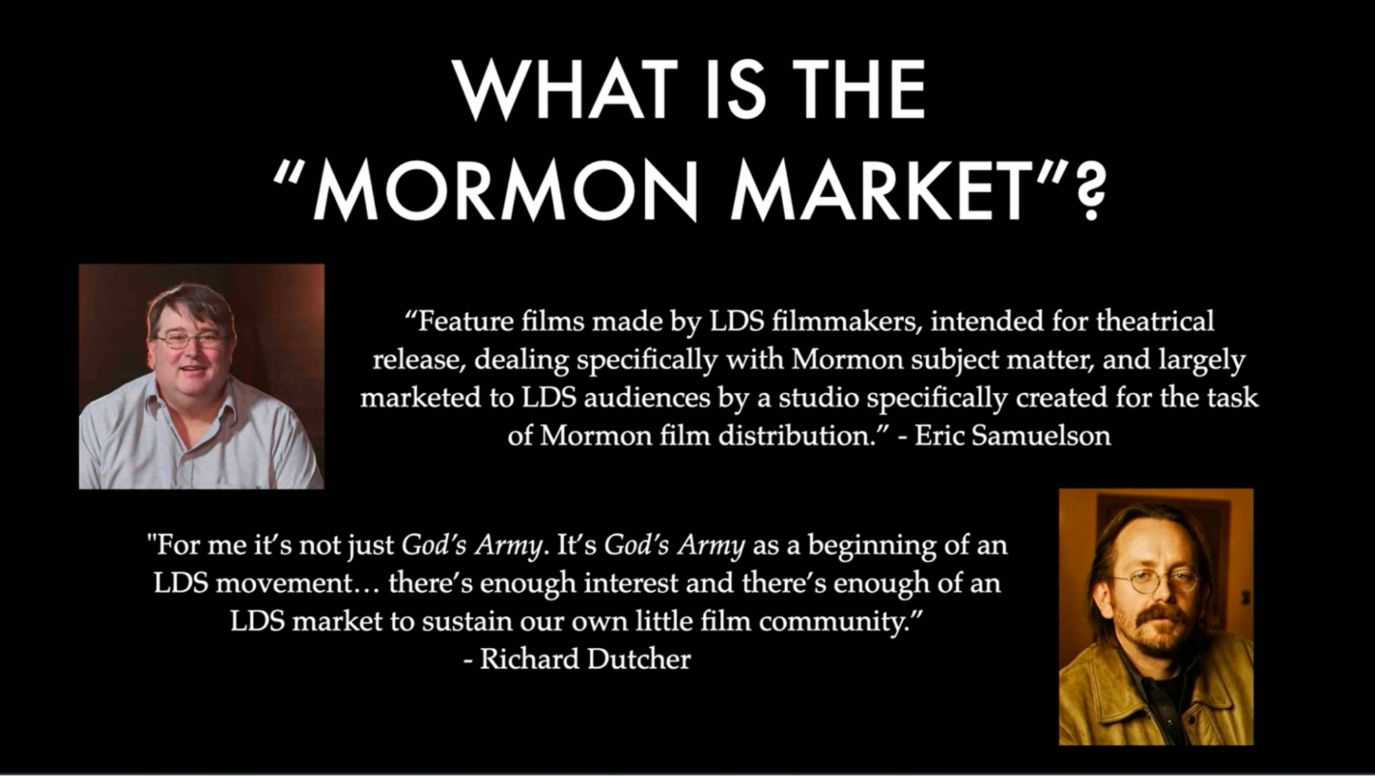 For me it’s not just God’s Army. It’s God’s Army as a beginning of an LDS movement… there’s enough interest and there’s enough of an LDS market to sustain our own little film community.”