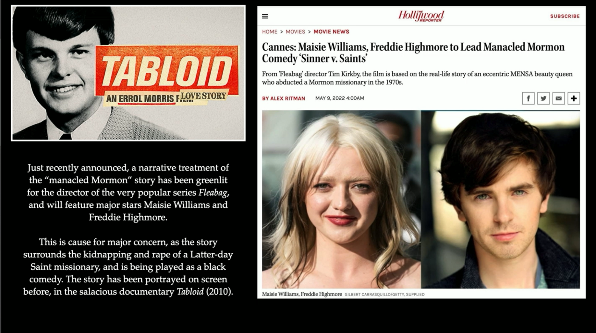 One that was recently announced, and had serious backlash, Sinner Versus Saints tells the story of the Manacled Mormon case. There was already a documentary made about this called Tabloid where a woman kidnapped a missionary and raped him. It’s being presented as a comedy, and if it’s not canceled, it’s set to go into production soon.