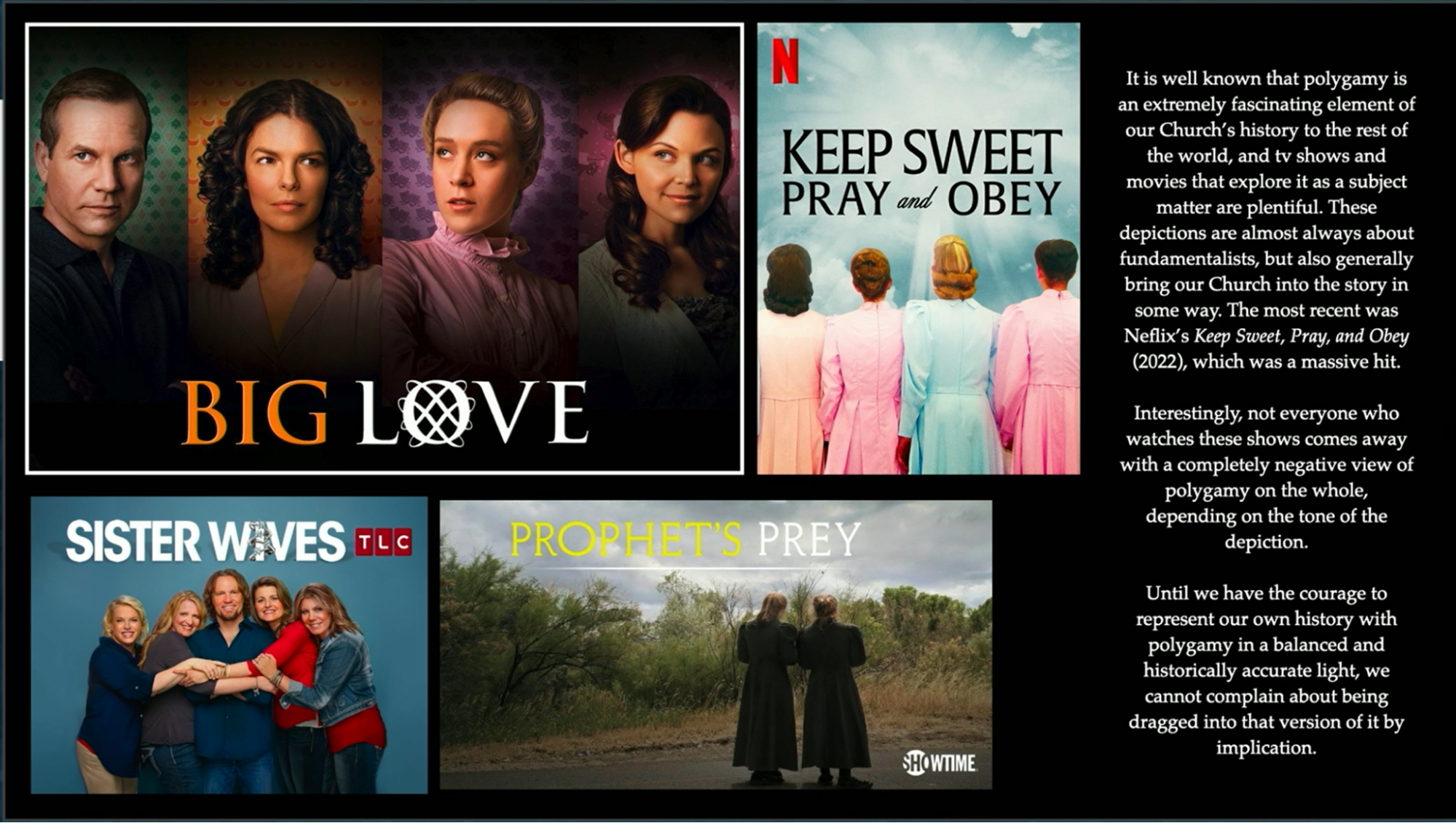 Polygamy has been a popular subject for a long time, and various shows, movies, and featurettes have incorporated it. In my opinion, until we have the courage to represent our own history with this, in a balanced and historically accurate light, we can’t complain about being dragged into that version by implication. Many of these shows touch on the Church, and while some do a better job of showing the separation of the two communities, like it or not there’s some link there, and we’ve never told our own version of this, at least on the screen.