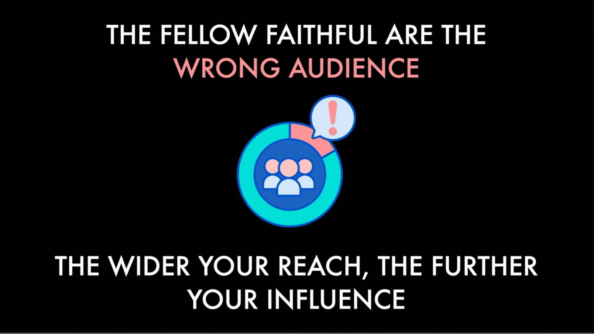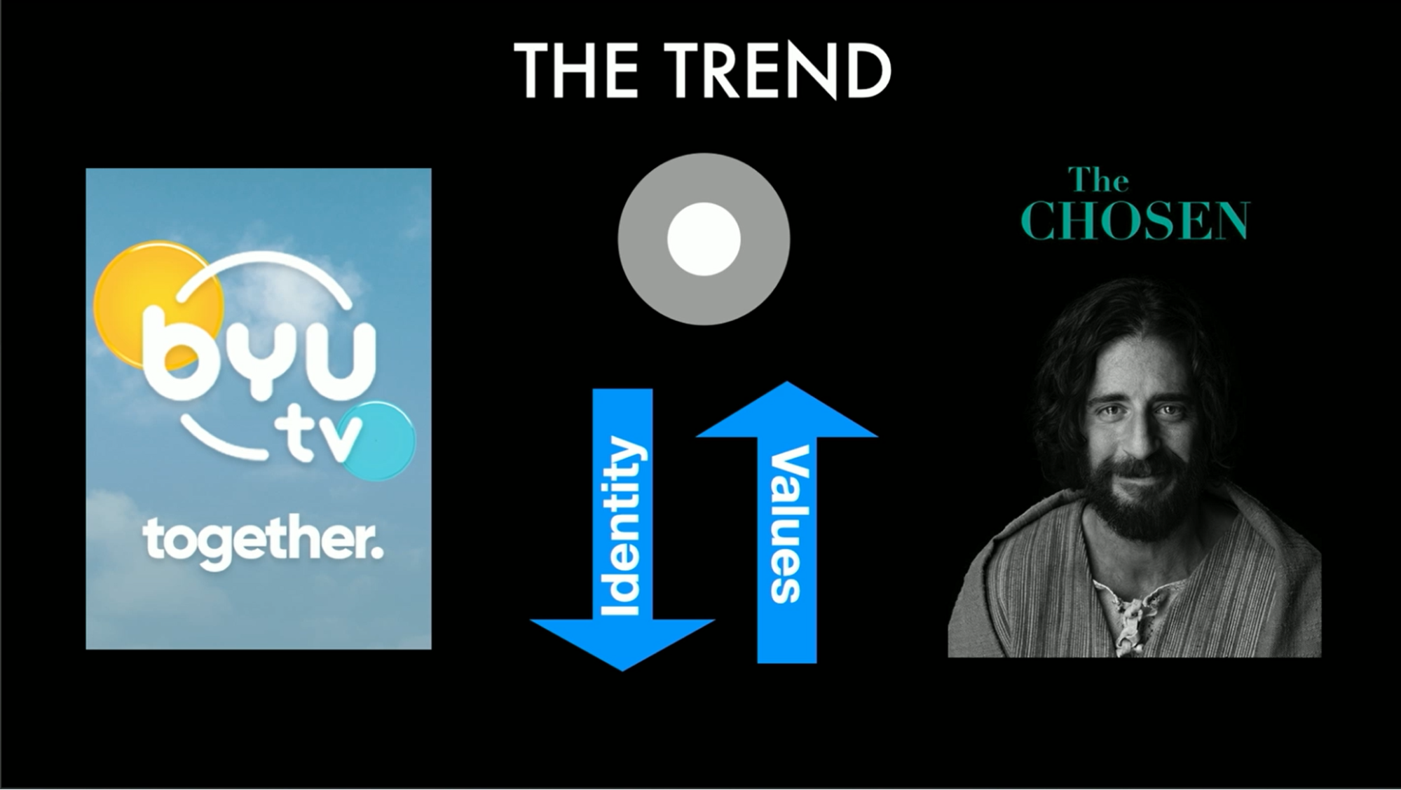The visual representation of this approach is depicted by two circles – one representing the Mormon or Latter-day Saint market and the other, a gray circle outside of it, symbolizing the potential reach beyond our specific identity. We can reach wider by doing that. BYUtv’s recent emphasis on shows and films aligns with this strategy, in their own words. That may be shifting, but this was the case when I put these slides together. The Chosen, a popular show among Christians, and that Latter-day Saints have been part of making, reflects this approach. Although maybe you’ve seen how hairy that can get to our other Christian brothers and sisters.