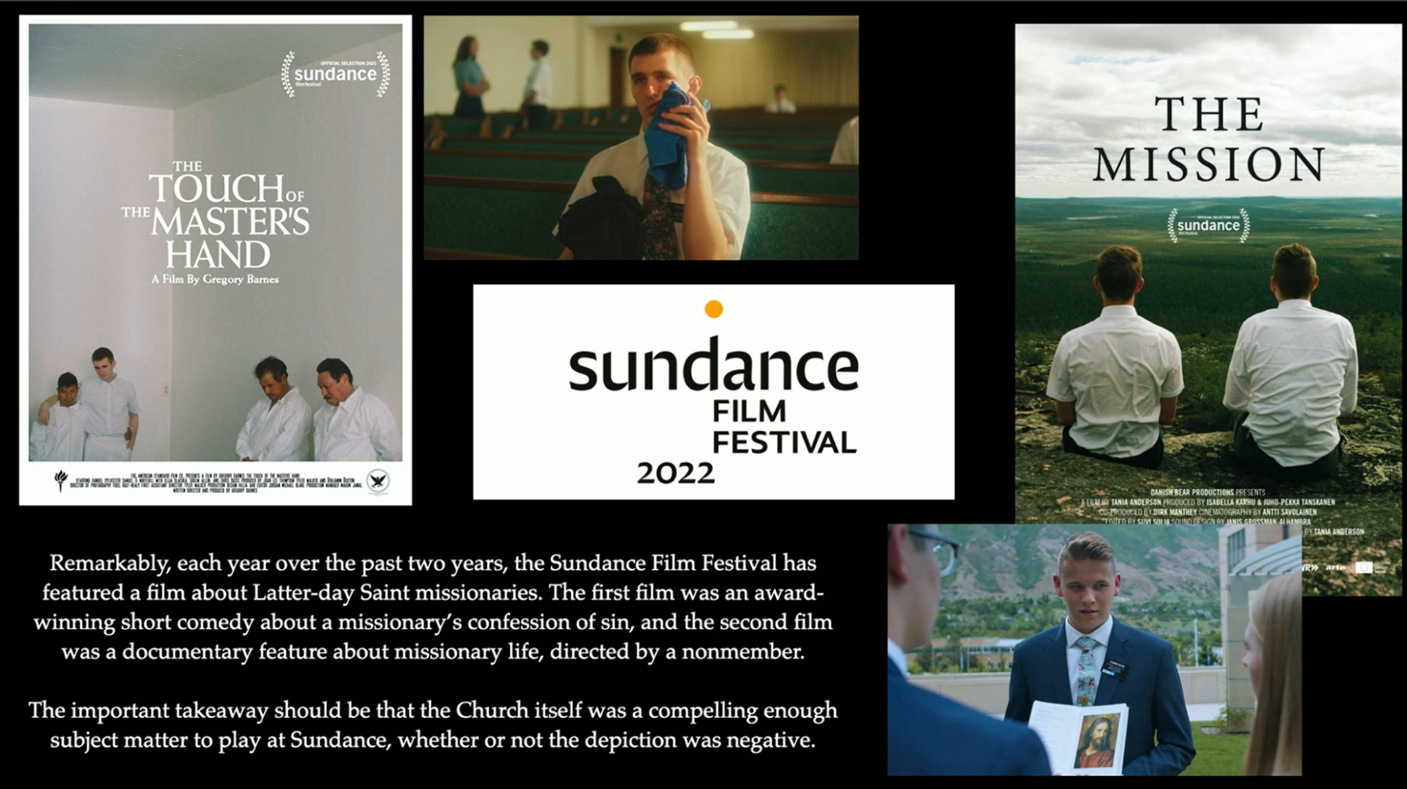 At the Sundance Film Festival, there are films like The Touch of the Master’s Hand, which is kind of a short comedy, and The Mission, which was made by a non-member, a long documentary depicting what a mission might be like. The important takeaway is that the Church itself was a compelling enough subject matter to play at Sundance, whether or not the depiction was negative.