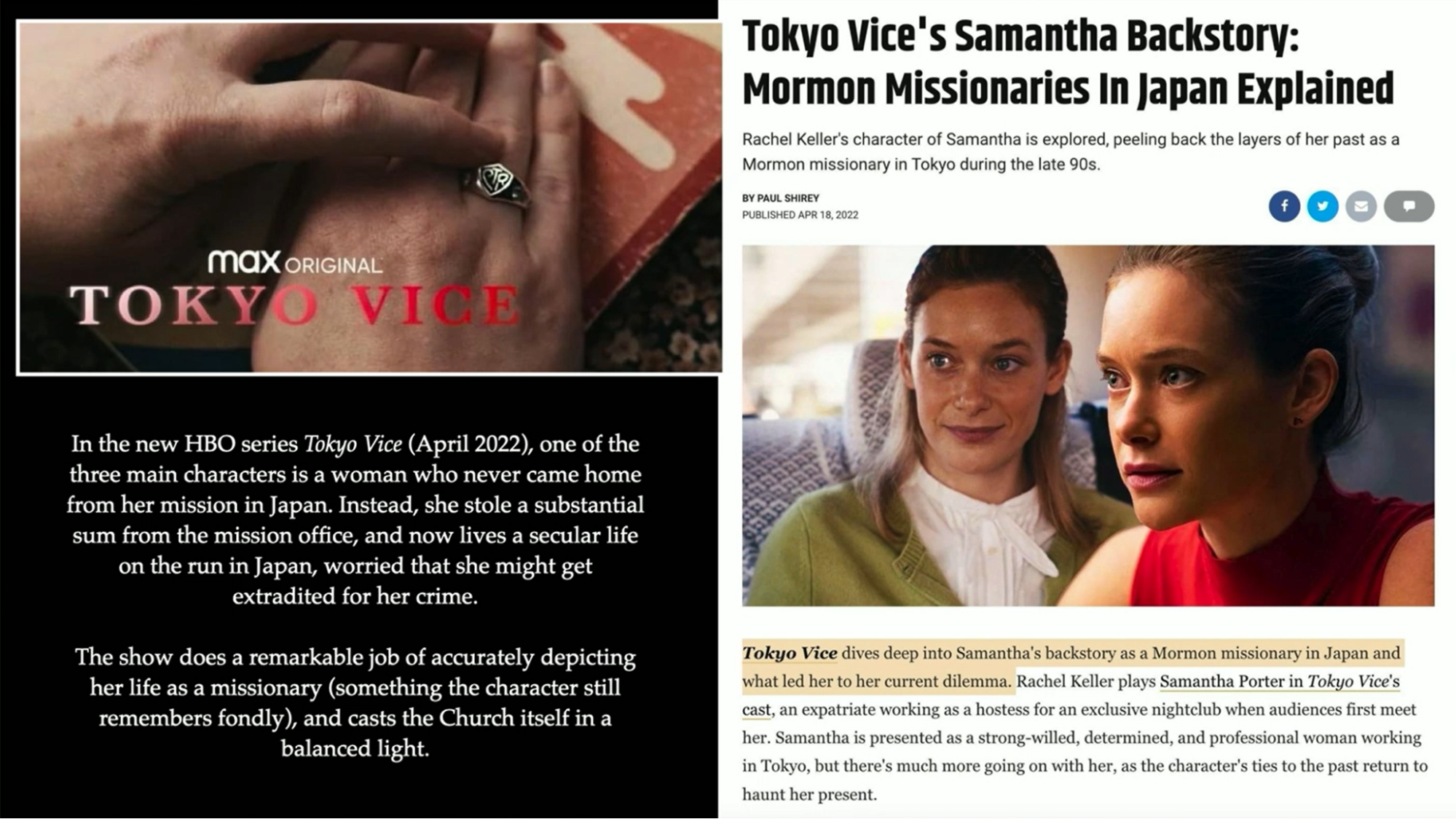 In Tokyo Vice, which is like a journalistic thriller show, one of the characters is a woman who was a missionary and then ended up stealing from her mission, and staying in Japan and fleeing. A private detective is hired to go find her and bring her back to the United States. But she looks back very fondly on her mission and wishes that she had that more pure, simple life of being a missionary. I was surprised at how accurate they portrayed Latter-day Saint missionaries. This was in 2022; it just came out in April.