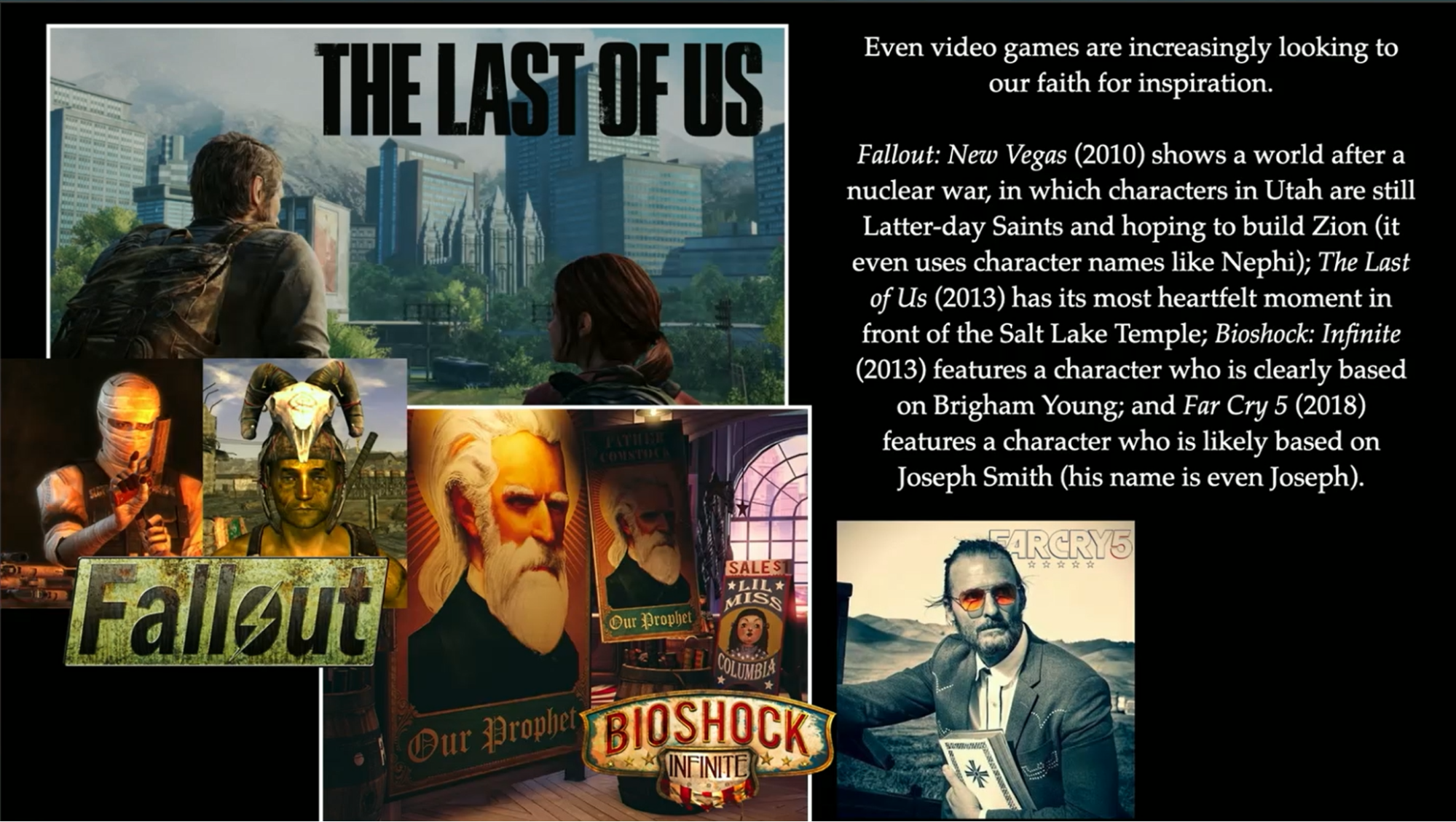 Moving beyond traditional media, even video games delve into our faith. The Last of Us has a climactic point in front of the Salt Lake Temple. Fallout features characters who are unmistakably Latter-day Saints. It’s after a nuclear holocaust and they’re living and trying to rebuild their community and their society. Bioshock has a character likely based on Brigham Young. Far Cry 5 introduces a character who bears a resemblance to Joseph Smith.