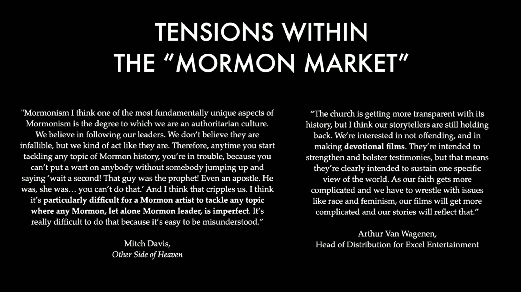 Arthur van Wagenen, head of distribution for Excel Entertainment, said, “The Church is getting more transparent with its history, but I think our storytellers are still holding back.” We’re interested in not offending, and in making devotional films. They’re intended to strengthen and bolster testimonies, but that means they’re clearly intended to sustain one specific view of the world.