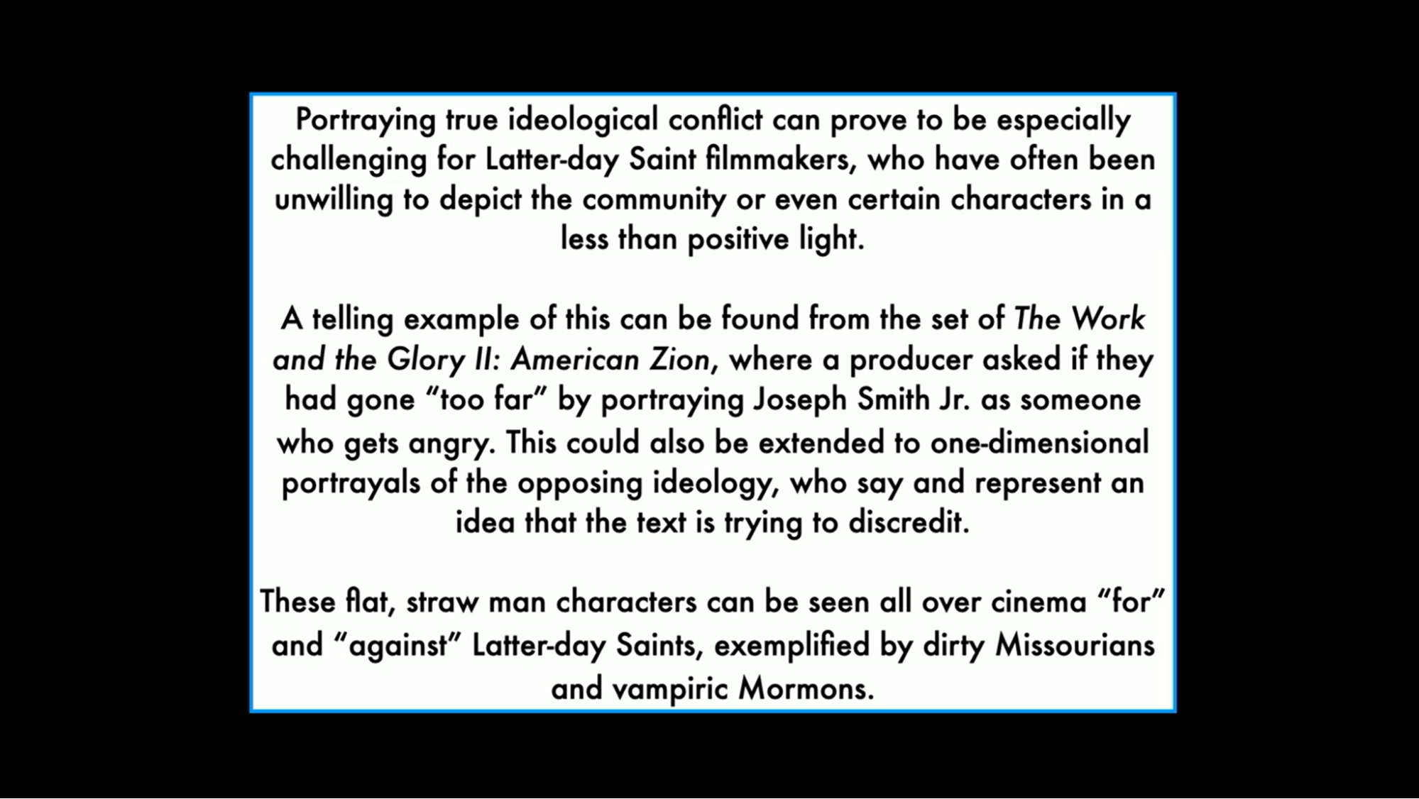 Portraying true ideological conflict can prove to be especially challenging for Latter-day Saint filmmakers, who have often been unwilling to depict the community, or even certain characters, in a less-than-positive light.