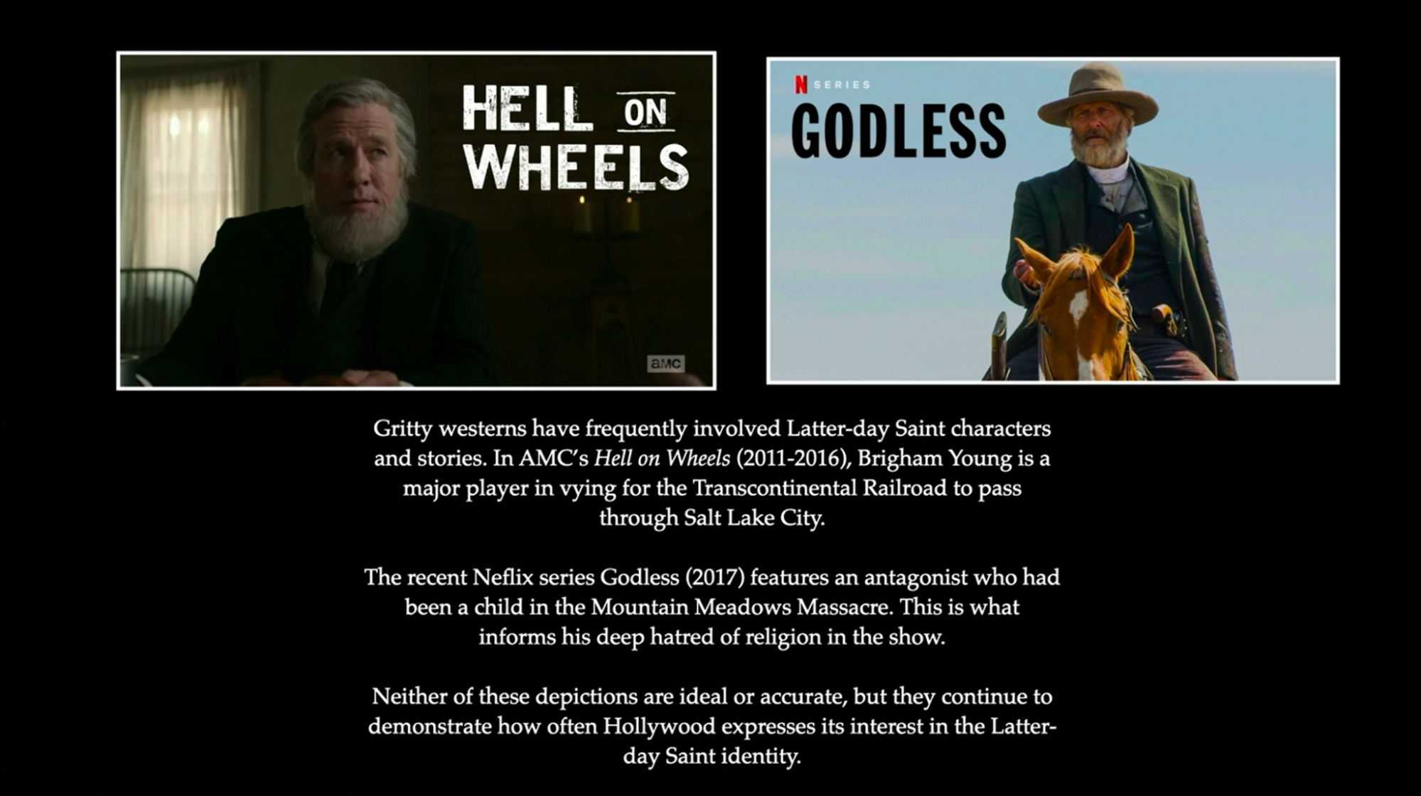 Gritty westerns frequently feature Latter-day Saint characters. AMC’s Hell on Wheels depicts Brigham Young as a main supporting character, vying to get the railroad to come through Salt Lake City instead of north through Ogden, I think. Godless, on Netflix, portrays a protagonist shaped by the Mountain Meadows Massacre, harboring a deep-seated hatred for religion.