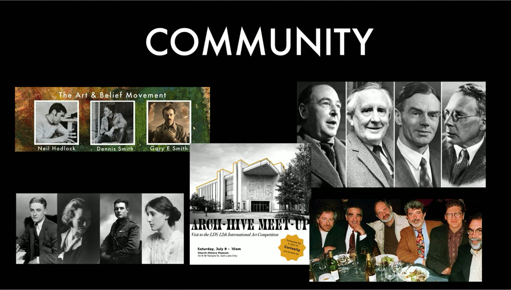 Some great examples of this are the Movie Brats from the 1970s. Most of you have probably heard of the Inklings, where Tolkien and C.S. Lewis collaborated with some others as well. The Lost Generation and some of these have existed within our own faith and belief movement. And the Archive, which is a current art community that makes interesting and new, unique Latter-day Saint art.