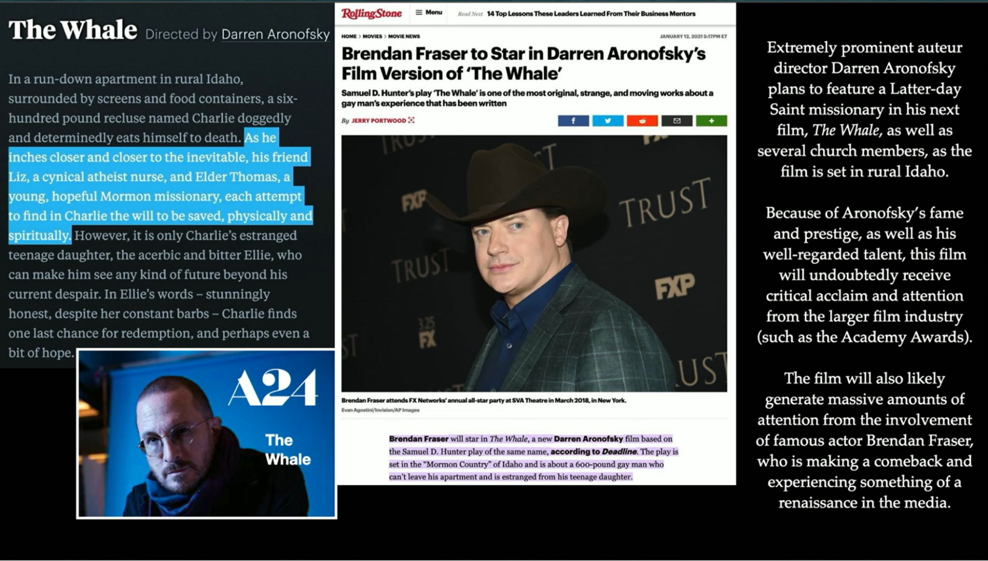 Coming out later this year is The Whale, featuring Brendan Fraser. He is a very, very overweight man, an atheist, who is befriended by a Latter-day Saint missionary, Elder Thomas, who is trying to help save him both physically and spiritually. Where Elder Thomas’ companion is, who knows, but at least Elder Thomas cares about poor Brenden Fraser. This film is part of what people are calling the Brendan Fraser Renaissance. He may be up for an academy award, because he’s back in the spotlight, and to be sure, The Whale and the depiction of a Latter-day Saint missionary will be part of it.