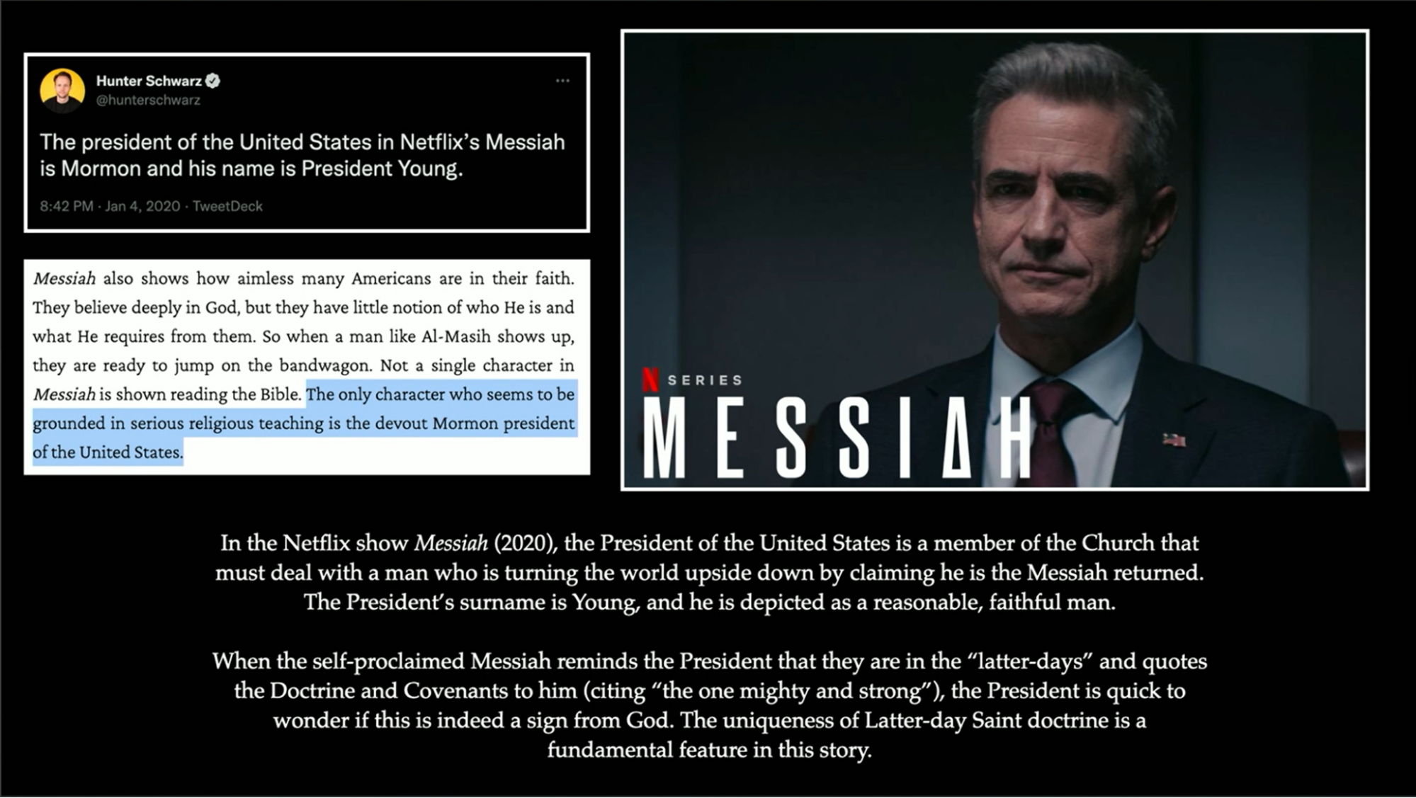 Moving to recent examples. I gave you some thematic stuff. Again, in 2020, Messiah on Netflix, depicts the President of the United States, President Young, dealing with a Messianic character claiming to be the Messiah. And this president has to wrestle with that. It even cites, “the one mighty and strong,” from the Doctrine and Covenants, which I found kind of surprising.