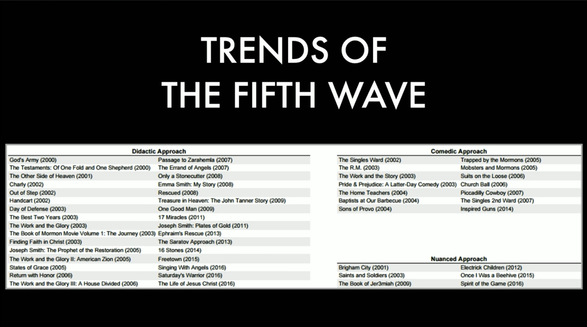 In my 2017 essay, I tried to categorize the films made by, for, and about Latter-day Saints, into three categories: didactic, comedic, and nuanced. Nuanced meaning ambiguous films that weren’t trying so hard to preach a message, but rather just trying to tell a good story, but were unabashedly Latter-day Saint in their context. Didactic is the largest group by far, followed by comedic, which includes self-referential films, and the smallest category is nuanced films. We’ll get back to that in a moment.