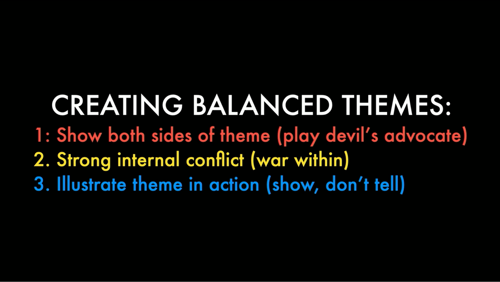 - Show both sides of the theme. Play devil’s advocate with your own themes and your own beliefs. Ultimately, if you have something you want to say by the end of the film, say it. But play devil’s advocate with it. We need more conflict and scrutiny, especially if the message is going to land.