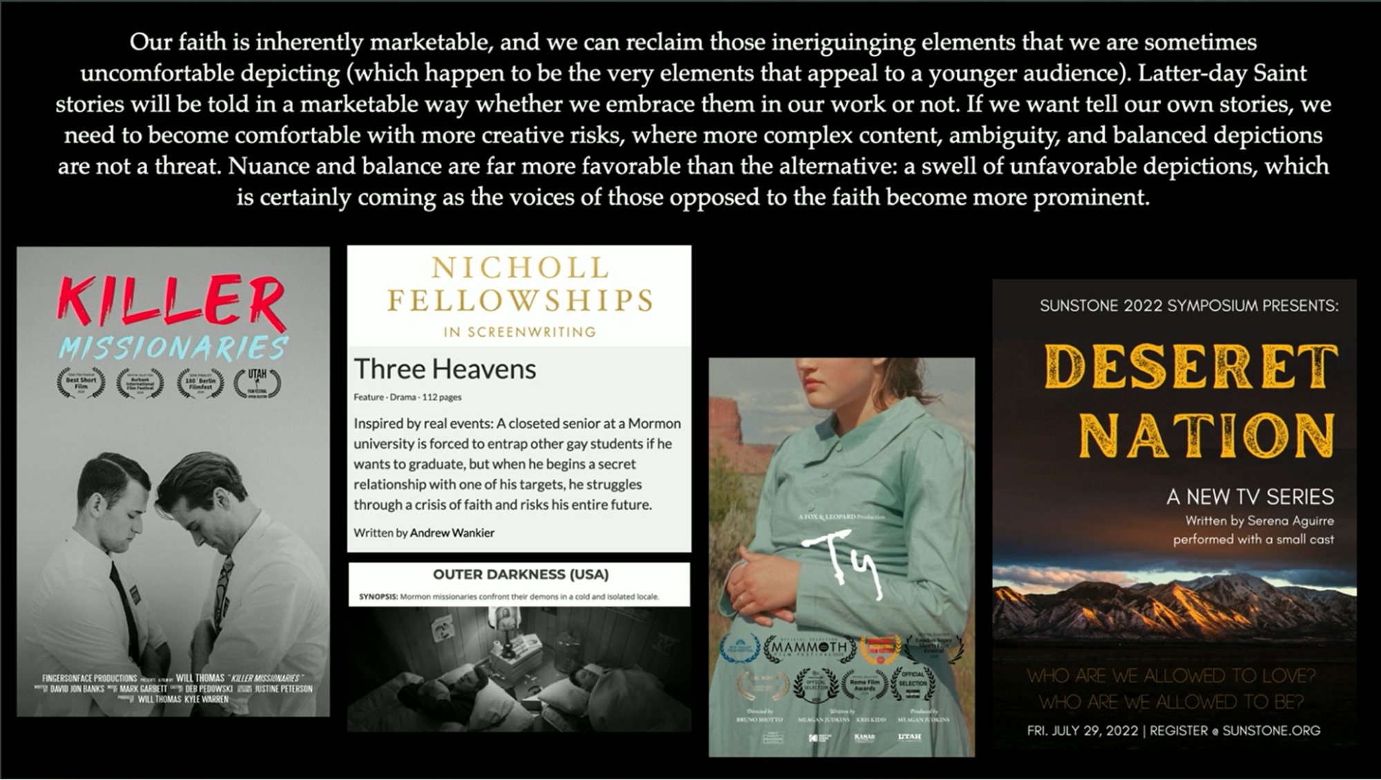 Latter-day Saints’ stories need to be told in a marketable way, whether we embrace them in our work or not. If we want to tell our own stories, we must become comfortable with taking more creative risks, presenting more complex content and ambiguity, and balanced depictions are not a threat. Nuance and balance are far more favorable than the alternative of the swell of unfavorable depictions which is certainly coming, as the voices of those opposed to the faith become more prominent. I would suggest that it’s only beginning now.