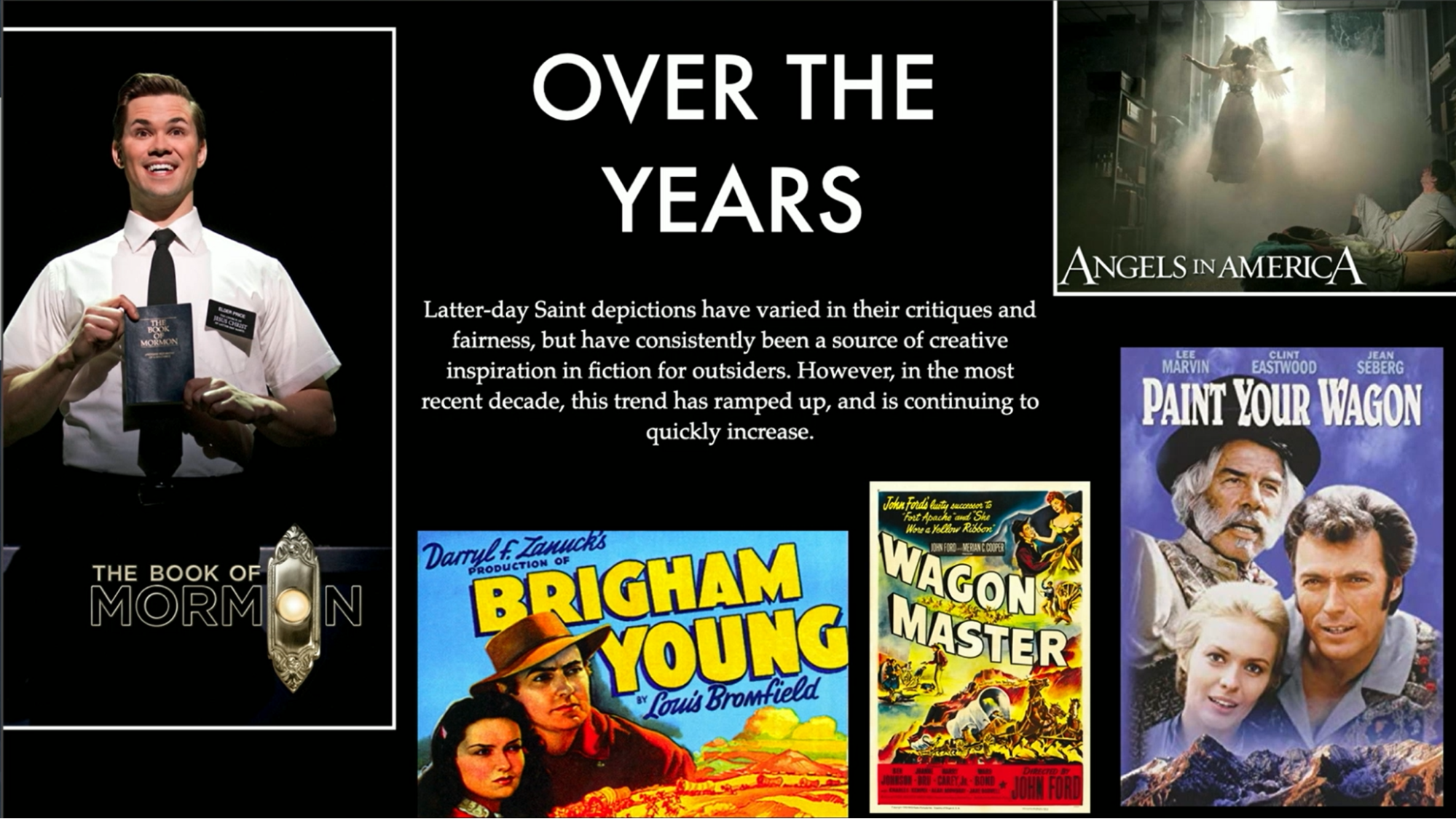 There are several questions here. One person suggested making the Hole in the Rock Expedition, a film. One observation is that classic films with religious elements, as discussed in a BYU theater class, offer opportunities for discussion based on character interactions and experiences. Some of our existing films are heavy-handed in pushing a dogma, such as ‘Under the Banner of Heaven,’ which portrayed Mormons negatively.