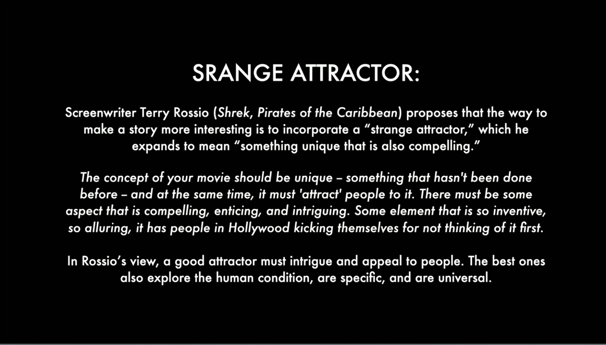 What do I mean by “strange attractor?” Screenwriter Terry Rossio, who wrote Shrek, Pirates of the Caribbean, and other very successful, popular films, proposes that the way to make a story more interesting is to incorporate a “strange attractor,” which he expands to mean something unique, that is also compelling. He goes on to say,