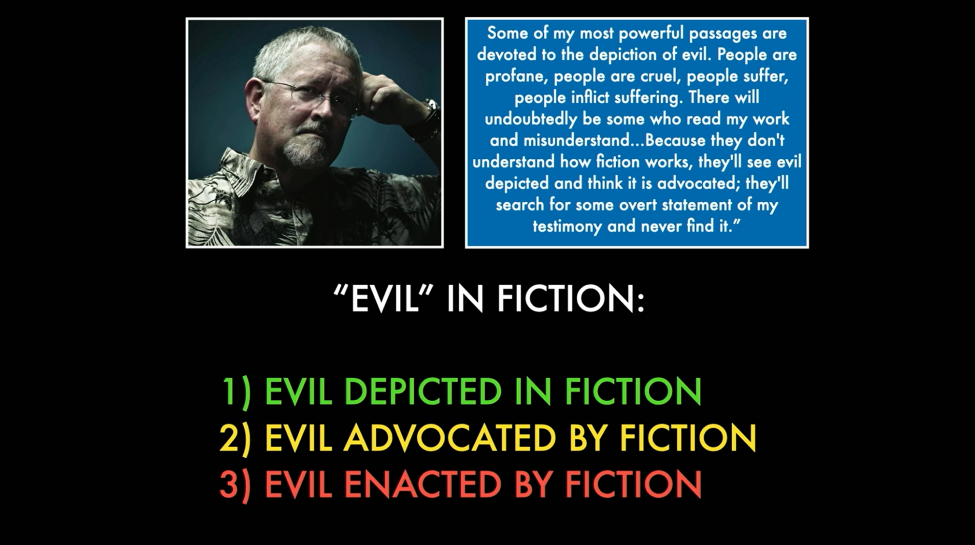 Orson Scott Card talks about evil in fiction, and how many people who consume fiction don’t completely know the difference between evil depicted in fiction, evil advocated by fiction, and evil enacted by fiction. An easy example of evil enacted by fiction would be pornographic novels or films. Pornography is evil, the thing is evil. Evil advocated by fiction would be a film or a movie saying that evil is okay. Where that is ultimately the theme. Evil depicted in fiction shows you that those things are present, but is not advocating for them in its overall message.