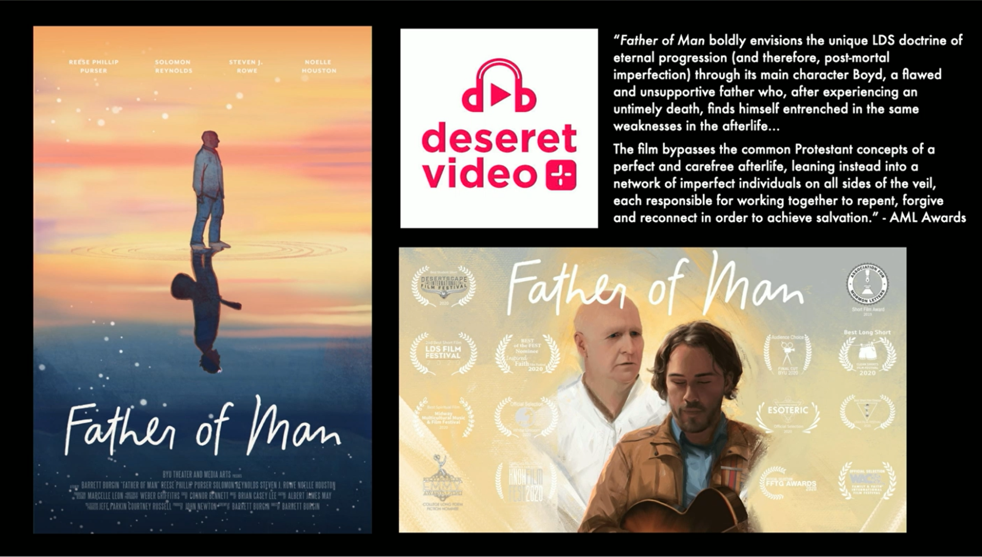 Father of Man boldly envisions the unique LDS doctrine of Eternal Progression, therefore, post-mortal imperfection through its main character, Boyd, a flawed and unsupporting father. After experiencing an untimely death, he finds himself entrenched in weaknesses in the afterlife. The film bypasses common Protestant concepts of a perfect and carefree afterlife, instead leaning into a network of imperfect individuals on all sides of the veil, working together to repent, forgive, and reconnect for salvation.”