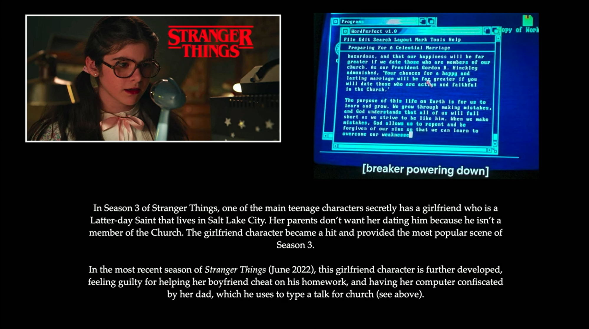 Stranger Things Season 3 has a main teenage character with a Latter-day Saint girlfriend from Salt Lake City. Her parents don’t want her dating him because he’s not a member of the Church. She goes on to have a big role in season 4 as well. In the slide, you can see where her dad is typing up a talk he’s going to give in Church on marriage. I read it and it’s not bad. Maybe I’ll take some notes