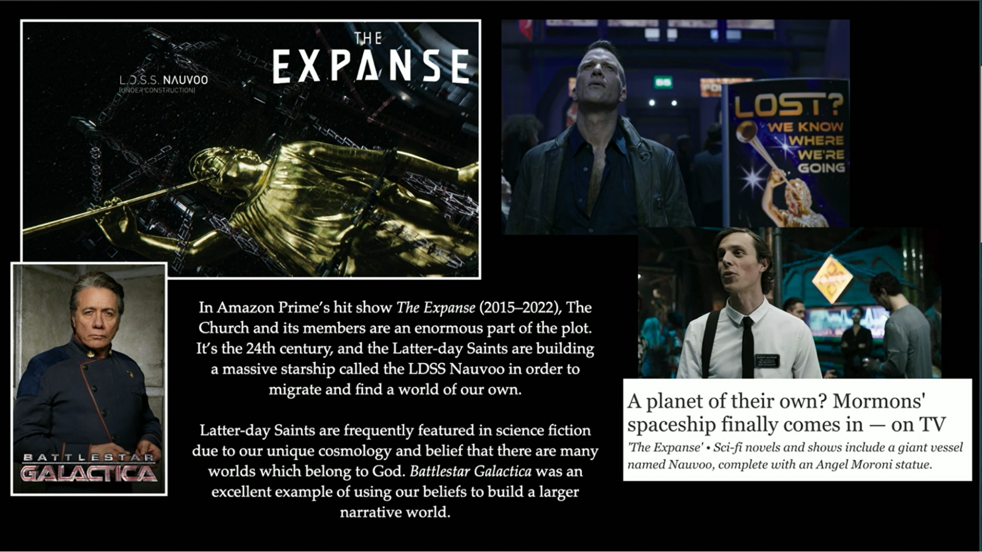 The Expanse is one of the most popular Sci-Fi shows on Amazon Prime, the LDS Nauvoo is a starship intended to transport Latter-day Saints to a new planet, emphasizing their desire for autonomy. I believe the starship gets taken away from them, but they are just depicted as this powerful group that is just trying to do their own thing. And of course, Battlestar Galactica, penned originally by a member, has lots of lore and cosmology from our own background and ideas about the planets and their rotation and things like that, as well as a quorum of the twelve, and all these references.